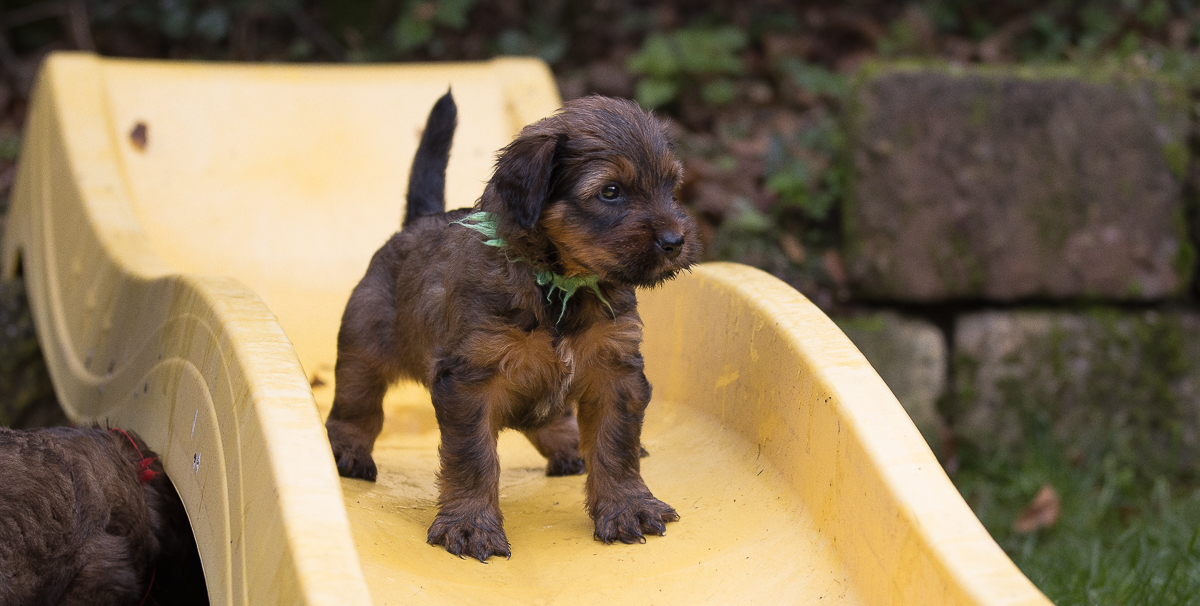 ... alle 11 Hummelchen flitzen mit ... ohne zu zögern haben sie innerhalb von einem Tag ihren gesamten Welpengarten in Beschlag genommen. Egal ob Wackelbrett, Gitterrost, Rutschbahn oder Tunnel, alles wird hemmungslos benutzt. Sämtliche Blätter und Gräser werden auf ihre Fresstauglichkeit überprüft, was uns einige schlaflose Nächte und Berge von Wäsche eingebracht hat, denn was oben reingefuttert wird, kommt auch unweigerlich am anderen Ende wieder raus ... leider in flüssiger Form. Besuch - ob groß oder klein - wird stürmisch begrüßt, durchgekaut und als Klettergerüst genutzt. Wir hoffen sehr, das Wetter ist uns in den nächsten 3 Wochen gut gesonnen und wir haben noch etwas vom hoffentlich goldenen Oktober, denn nur das Welpenzimmer ist der Bande ganz klar zu langweilig.